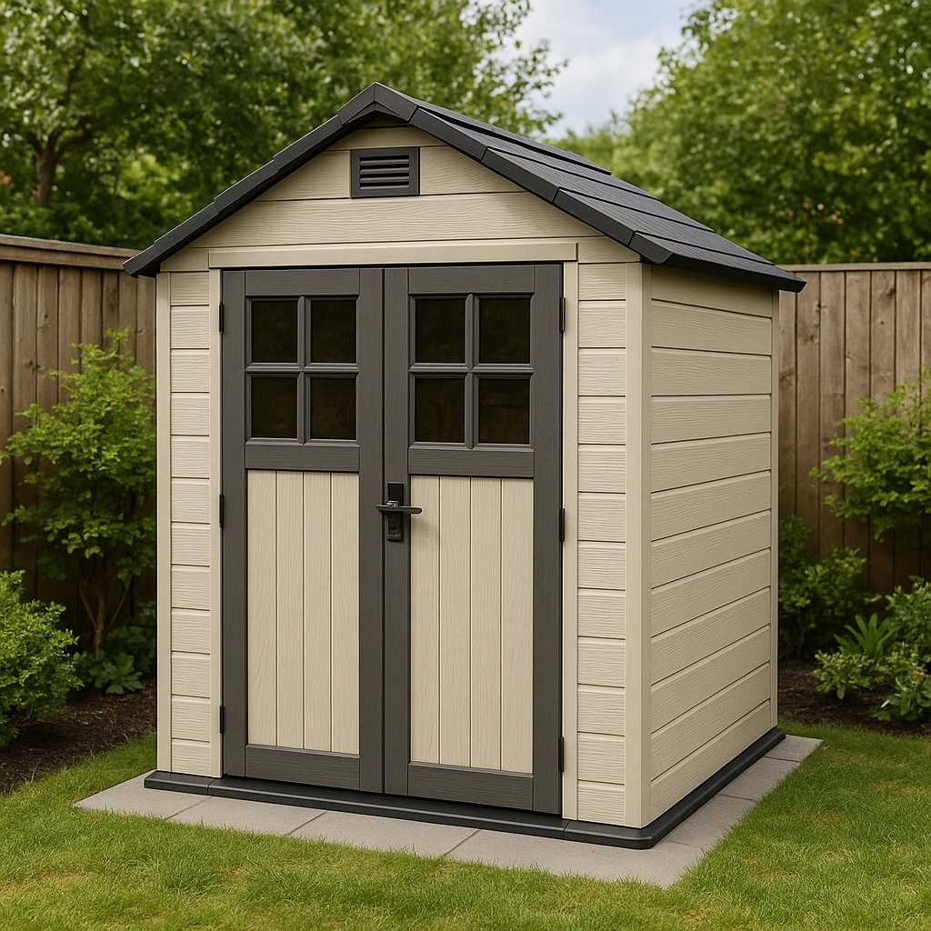 Abri de jardin resine 200x150x210cm beige murs noir toit avec double porte vitrée - Rangement extérieur