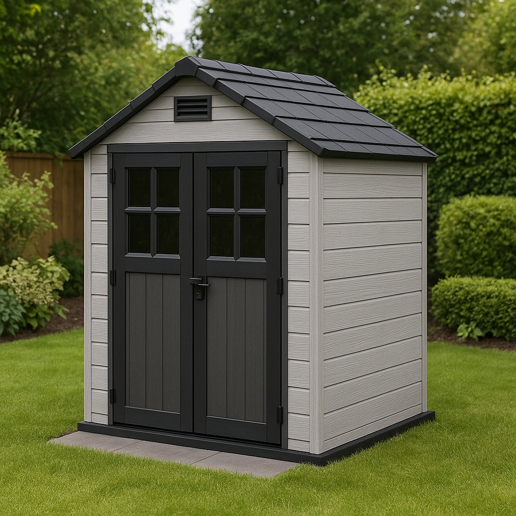 Abri de jardin resine 210x180x230cm Gris clair Porte et fenêtre noires Toit en pente Noir Rangement extérieur pratique