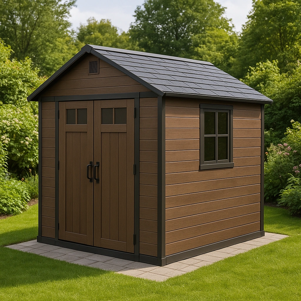 Abri de jardin resine 240x180x220cm Marron toit en noir Abri avec double porte et fenêtre pour rangement extérieur
